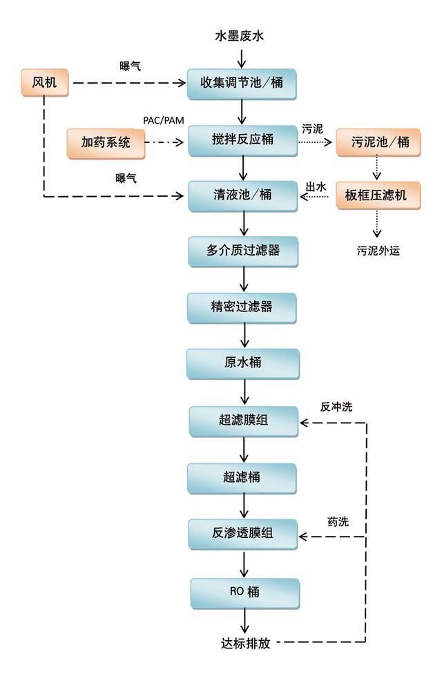 水性油墨廢水作為工業印染廢水中的一種新型、典型廢水,它的突出特點是高CODcr、BOD、高色度和生物難降解。 工藝流程:該污水處理循環系統通過物理方法有效去除污水中的污染色,達到清水的清澈度。并中和污水的酸度、堿度,去除污水里的有害物質,使其沉淀后固廢進行分離。由離心泵將廢水中的清液輸入到精密過濾裝置和碳砂過濾裝置進行過濾。最后,進入超濾膜和反滲透膜過濾,反滲透膜過濾微孔<0.0001微米,能徹底濾除水中細菌及細小的物質分子。經過反滲透膜過濾后的水為RO純水,可循環使用,達到零排放,避免了普通環保處理過程的二次污染。